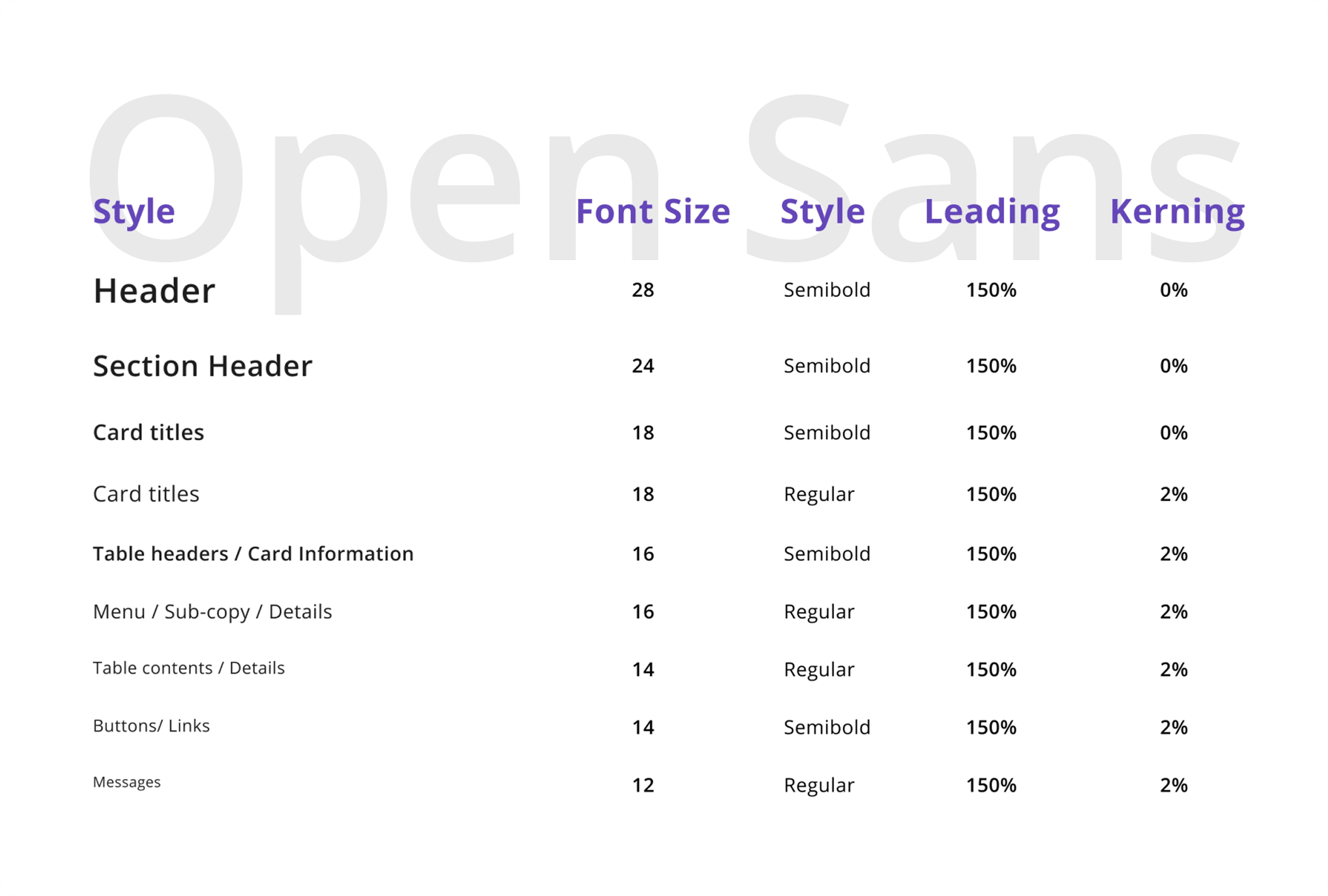 For our design system, we selected a sleek and versatile typeface. Open Sans emerged as our choice for its ideal geometric structure and well-balanced inter-character spacing. This adaptable typeface offers a range of weight variations, making it perfect for both headers and body text. Additionally, we ensured compatibility with right-to-left alignment, catering to the requirements of Arabic script and layouts.